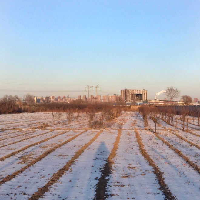 Who knows how long these small farms have been here? Longer than the box building in the background. Longer than the smokestack.