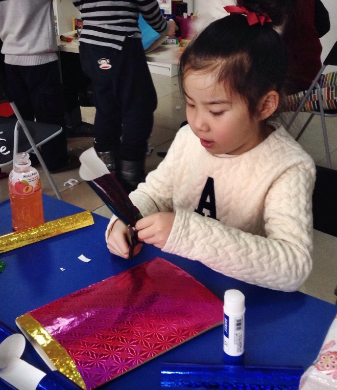 She was singing while she made her shiny notebook.
