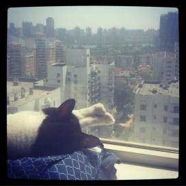 This was taken on our anniversary, though that’s not why I took it. Our sweet, sweet boy used to love sitting in that window on the 18th floor. Until his black got too hot and he had to hide behind the curtain, that is. He was Superkitty. We lost him in November and miss him dearly. More tears.