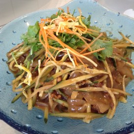 We had this noodle dish at almost every local meal in Shenyang. They serve it in restaurants, as street food, and in homes. This one was glass rice noodles and julienne cucumbers in a peanut sauce, a little carrot and cilantro as garnish. The first person mixes everything up with their chopsticks, then you slurp away.