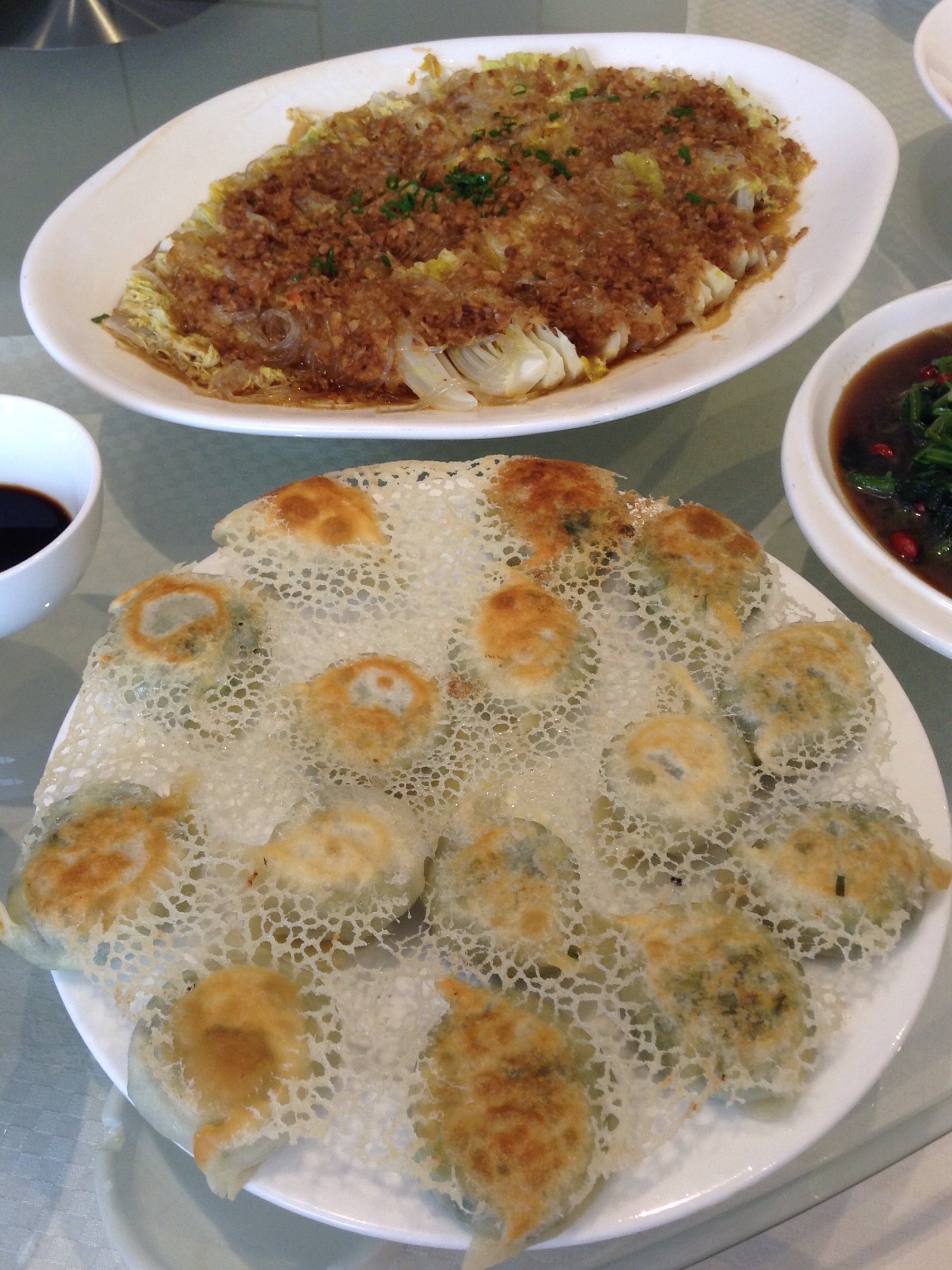 There were friend and steamed dumplings at this lunch. The stuffings were tomato/egg, pork/vegetable, and three treasures. In the background, you see the mandatory cabbage dish; this one had ground pork on top.