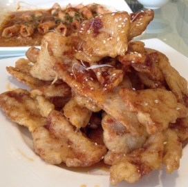 What a beautiful thing to find in China – sweet and sour pork so perfect and crispy! I doubt I’ll ever eat this in the US again. Thin slices of pork cooked in a perfect (hopefully) batter to make it crispy, with just drizzles of the sauce and ginger/spring onion shavings on top. And a few sesame seeds.