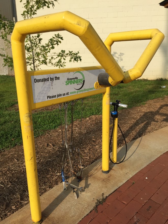 At one of the rest areas along the Swamp Rabbit Trail, there are bulletin boards and helpful kiosks. This stop, at about mile 29.5, featured a bike station with tools and air.